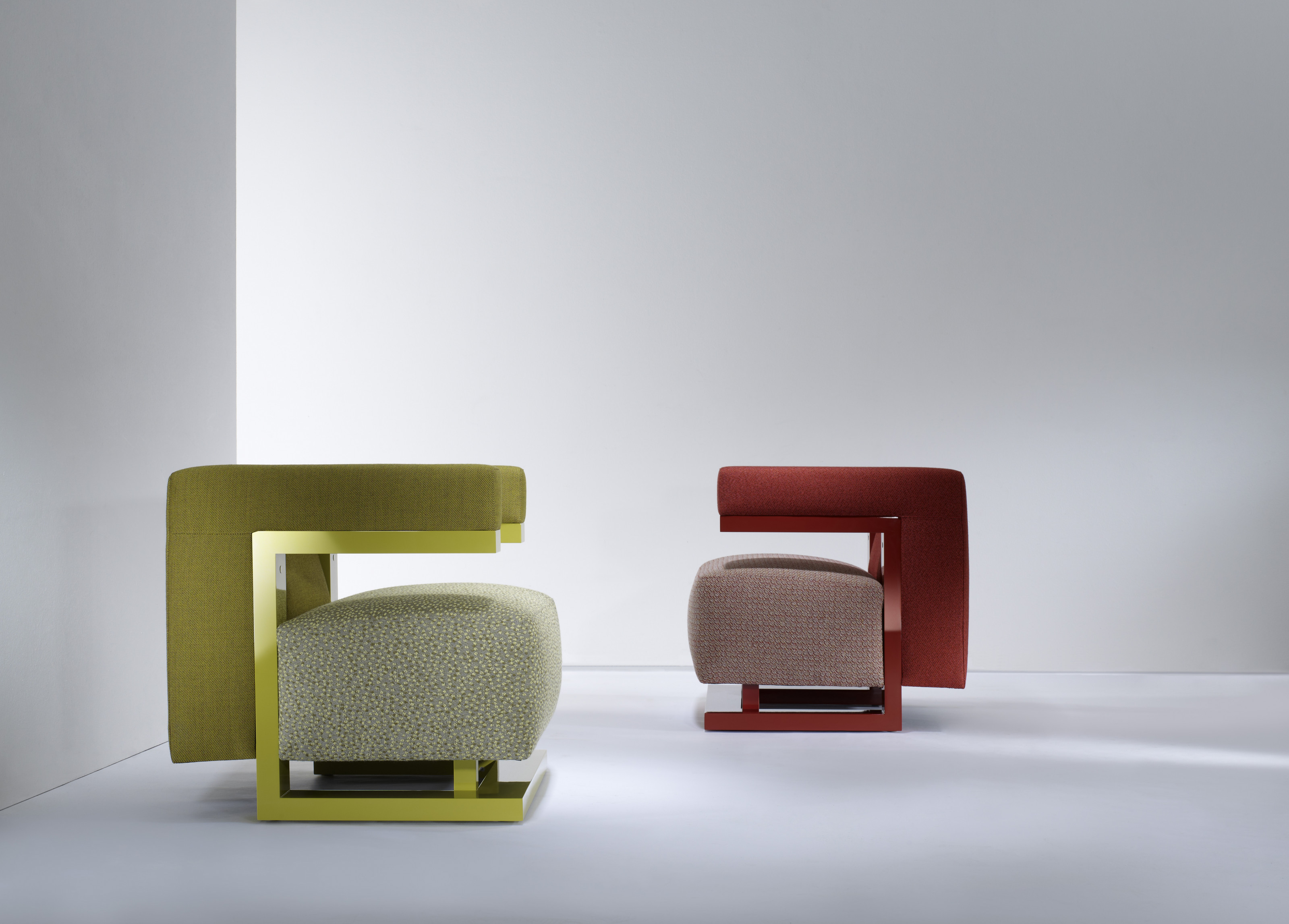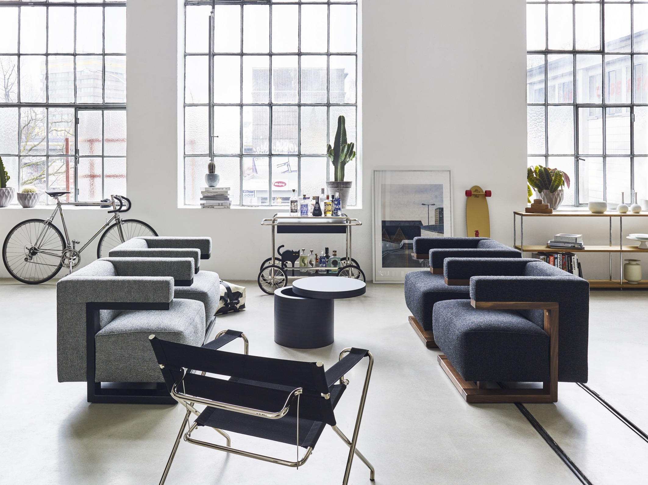 F51 - so heißt der kubische Sessel von Walter Gropius, produziert durch Tecta. Gropius, Architekt und Gründer des Bauhauses, hat dieses Sitzmöbel 1922/23 für das streng geometrisch durchdeklinierte Direktorenzimmer im Bauhaus Dessau entworfen (das man übrigens noch heute im Originalzustand besuchen kann – F51 inklusive). Der F51 ist nicht nur ein ikonischer sondern gleichzeitig sehr bequemer Sessel – die Üppigkeit der Polster, die über dem Boden zu schweben scheinen, kann einen schon leicht zum Schmunzeln bringen. Damals völlig neu war das geometrische Traggerüst mit frei auskragenden Armlehnen. Es ist heute in Eiche, Nußbaum, Esche natur, sowie schwarz und weiß erhältlich. Während der Sessel von Tecta lange Zeit sehr reduziert in den Farben produziert wurde, kann man ihn heute in über 100 Farben bestellen, in verschiedenen Stoffen als auch in Leder. Den Entwurf gibt es auch als Zweisitzer.